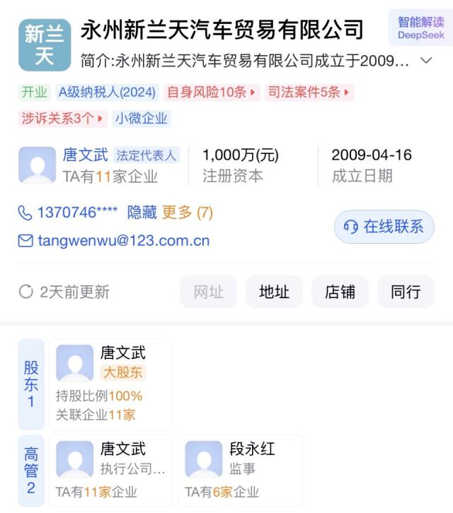 唐蕾是永州当地的另外两家汽车销售劳动公司的法东说念主和董事,而这两家公司的最大鼓舞皆是唐文武,从侧面印证了两个东说念主之间的相干。