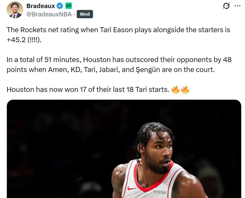 伊森首发时交出如斯夸张的数据证实并非无意,而是他的才气完好契合火箭队攻防体系,省略让身旁其余球员得回更好的施展空间。
