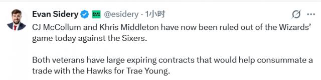 Sidery 还默示,一笔来往或将很快结束。奇才的两位宿将均握有大额到期协议,这将有助于促成奇才与老鹰对于特雷 - 杨的来往谈判,使薪资匹配更具可行性。