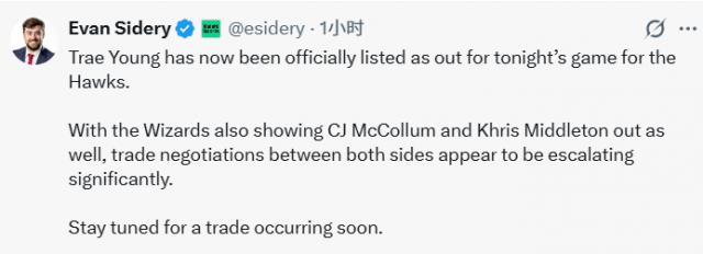 此前,Shams 报说念,特雷 - 杨的牙东说念主团队仍在与老鹰管制层握续调换,勤恳于结束特雷 - 杨离队的来往决议。音问源同期指出,老鹰队也在多条来往痕迹上积极鼓动谈判。名记 Stein 报说念,老鹰对奇才的基斯珀特感兴味,但愿将他加入到杨的来往中,赛前,基斯珀特也细目因伤病管制缺阵。